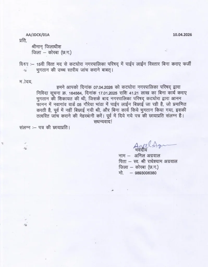 जिसके बाद अधिकारी और ठेकेदार ने आनन फानन में नवागांव वार्ड क्रमांक 05 गौरेला मार्ग में पाइप लाइन बिछाने का कार्य शुरू किया गया। शिकायतकर्ता अनिल अग्रवाल ने अब इस पूरे मामले की शिकायत कोरबा कलेक्टर कुणाल दुदावत से की है। जिसमें उन्होने नगर पालिका परिषद में व्याप्त भ्रष्टाचार और जनहित के कार्यो में खिलवाड़ का गंभीर आरोप लगाया है। कटघोरा नगर पालिका परिषद में सामने आया यह पूरा मामला न केवल प्रशासनिक लापरवाही, बल्कि सुनियोजित भ्रष्टाचार की ओर इशारा करता है।