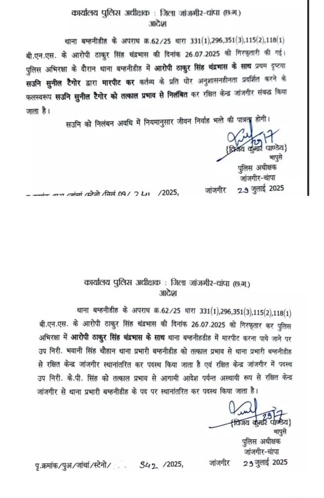एसपी की इस कार्रवाई के बाद पुलिस विभाग में हड़कंप मचा हुआ है। जानकारी के मुताबिक ये पूरा मामला बम्हनीडीह थाना क्षेत्र का है। बताया जा रहा है कि 26 जुलाई को पुलिस ने ठाकुर सिंह चंद्रभास को गिरफ्तार किया था। थाने में गिरफ्तार आरोपी के साथ एएसआई सुनील टैगोर ने जमकर मारपीट की थी। इस बात की शिकायत मिलने के बाद एसपी विजय पांडेय ने घटना की जांच का आदेश दिया था।