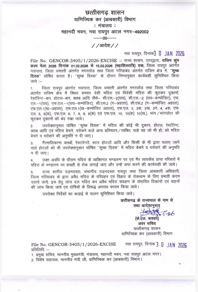 गरियाबंद : राजिम कुंभ (कल्प) मेला 2026 के दौरान धार्मिक गरिमा, कानून व्यवस्था और सामाजिक सौहार्द बनाए रखने के उद्देश्य से छत्तीसगढ़ शासन ने बड़ा निर्णय लिया है। वाणिज्यिक कर (आबकारी) विभाग द्वारा जारी आदेश के अनुसार 01 फरवरी 2026 से 15 फरवरी 2026 (महाशिवरात्रि) तक राजिम कुंभ मेला क्षेत्र को शुष्क दिवस घोषित किया गया है। यह आदेश जिला रायपुर अंतर्गत नवापारा, जिला धमतरी अंतर्गत मगरलोड तथा जिला गरियाबंद अंतर्गत राजिम क्षेत्र में प्रभावशील रहेगा।