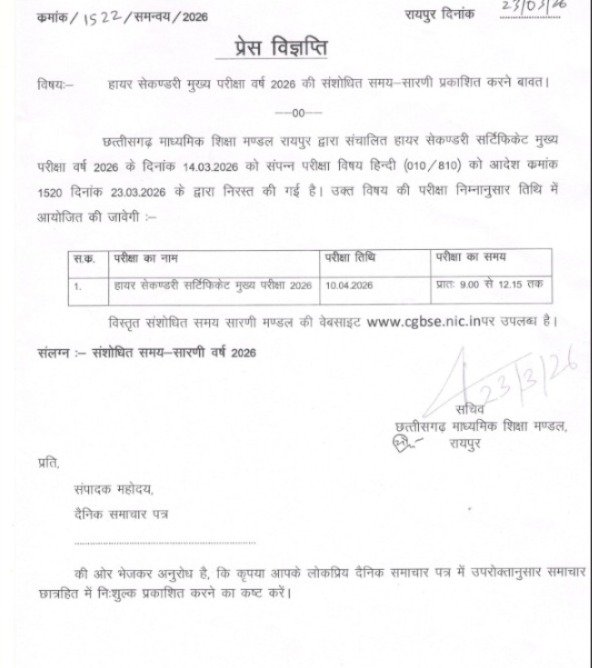 रायपुर : छत्तीसगढ़ माध्यमिक शिक्षा मंडल ने 12वीं बोर्ड की हिंदी विषय की परीक्षा को तत्काल प्रभाव से निरस्त कर दिया है. यह कड़ा फैसला परीक्षा से एक दिन पहले सोशल मीडिया पर प्रश्न पत्र के तेजी से वायरल होने और लीक की पुष्टि होने के बाद लिया गया है. मंडल ने छात्रों की सुविधा के लिए नया टाइम टेबल भी जारी कर दिया है, जिसके अनुसार अब हिंदी की परीक्षा 10 अप्रैल को आयोजित की जाएगी. पेपर लीक की इस घटना से प्रदेश भर के लाखों छात्रों में भारी रोष और चिंता देखी जा रही है. शिक्षा विभाग ने मामले की उच्च स्तरीय जांच के आदेश दिए हैं और साइबर सेल उन ग्रुप्स की पहचान कर रही है जहां से पेपर वायरल हुआ था।