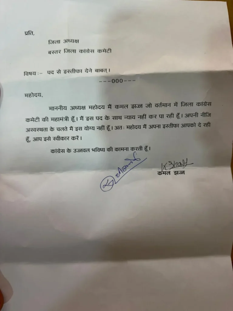 बस्तर कांग्रेस में जिला कांग्रेस कमेटी की महामंत्री कमल झज्ज ने अपने पद से इस्तीफा दे दिया है। बस्तर कांग्रेस के जिला अध्यक्ष को संबोधित अपने पत्र में कमल झज्ज ने व्यक्तिगत कारणों का हवाला देते हुए पद छोड़ने की बात कही है। आपको बता दें कि कुछ महीने पहले ही कमल की इस पद पर नियुक्ति नियुक्ति हुई थी। लेकिन अब उन्होंने पद छोड़ दिया है। इस्तीफे का पत्र भी सामने आया है।