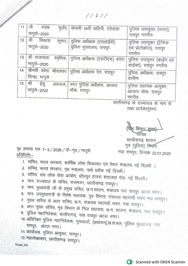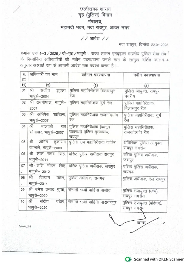 रायपुर : संजीव शुक्ला रायपुर के पहले पुलिस कमिश्नल होंगे। राज्य सरकार ने आज बड़ी संख्या में IPS अफसरों के ट्रांसफर किये हैं। वहीं रामगोपाल गर्ग को बिलासपुर का आईजी बनाया गया है। कई जिलों के एसपी भी बदले गये हैं।