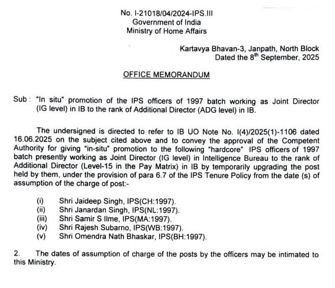 रायपुर : केंद्र सरकार ने IPS अफसरों को प्रमोशन दिया है। गृह मंत्रालय ने इंटेलिजेंस ब्यूरो (IB) के 1997 बैच के अफसरों को प्रमोशन देते हुए संयुक्त निदेशक (आईजी स्तर) से अतिरिक्त निदेशक (लेवल-15 पे मैट्रिक्स) के पद पर पदोन्नत करने की मंजूरी दे दी है। यह पदोन्नति आईपीएस टेन्योर पॉलिसी के पैरा 6.7 के प्रावधानों के तहत दी गई है। अधिकारियों को यह प्रमोशन उनके मौजूदा पद को अस्थायी रूप से अपग्रेड कर दिया जाएगा। प्रमोशन का लाभ उन्हें उस दिन से मिलेगा, जब वे अपने नए पद का कार्यभार ग्रहण करेंगे। जिन अफसरों को प्रमोट किया गया है, उसमें छत्तीसगढ़ कैडर के IPS जयदीप सिंह, IPS जनार्दन सिंह, IPS समीर एस, IPS राजेश सुबर्णो और IPS ओमेंद्र नाथ भास्कर शामिल हैं।