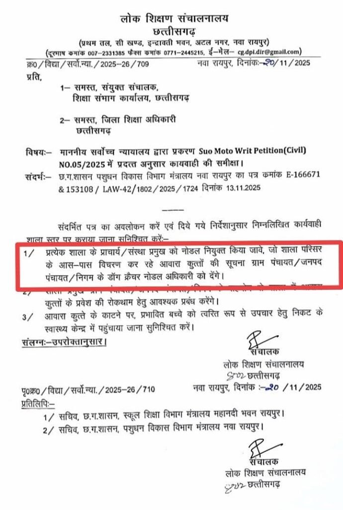 रायपुर : राजधानी रायपुर सहित छत्तीसगढ़ में अब कुत्तों की सूचना देने स्कूलों में नोडल नियुक्त किया जाएगा। जिसके लिए लोक शिक्षण संचालनालाय ने सभी DEO को पत्र भेजा है। जारी आदेश के अनुसार, स्कूल के प्राचार्य या संस्था प्रमुख नोडल नियुक्त होंगे, जो स्कूल के आसपास आवारा कुत्तों की सूचना देंगे। इसके साथ ही नजदीक के डॉग कैचर नोडल अधिकारी को भी सूचना देंगे। बता दें सुप्रीम कोर्ट के निर्देश के बाद यह पत्र जारी किया गया है।