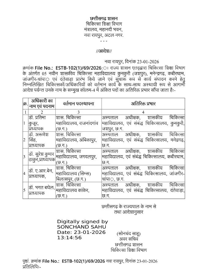 रायपुर : स्वास्थ्य विभाग में ट्रांसफर पोस्टिंग का आदेश जारी किया गया है। राज्य सरकार ने राजनांदगांव, अंबिकापुर, जगदलपुर, बिलासपुर और कांकेर जिले के मेडिकल कालेज में अस्पताल अधीक्षकों के साथ-साथ 5 मेडिकल कालेजों में डीन की भी नियुक्ति की है।