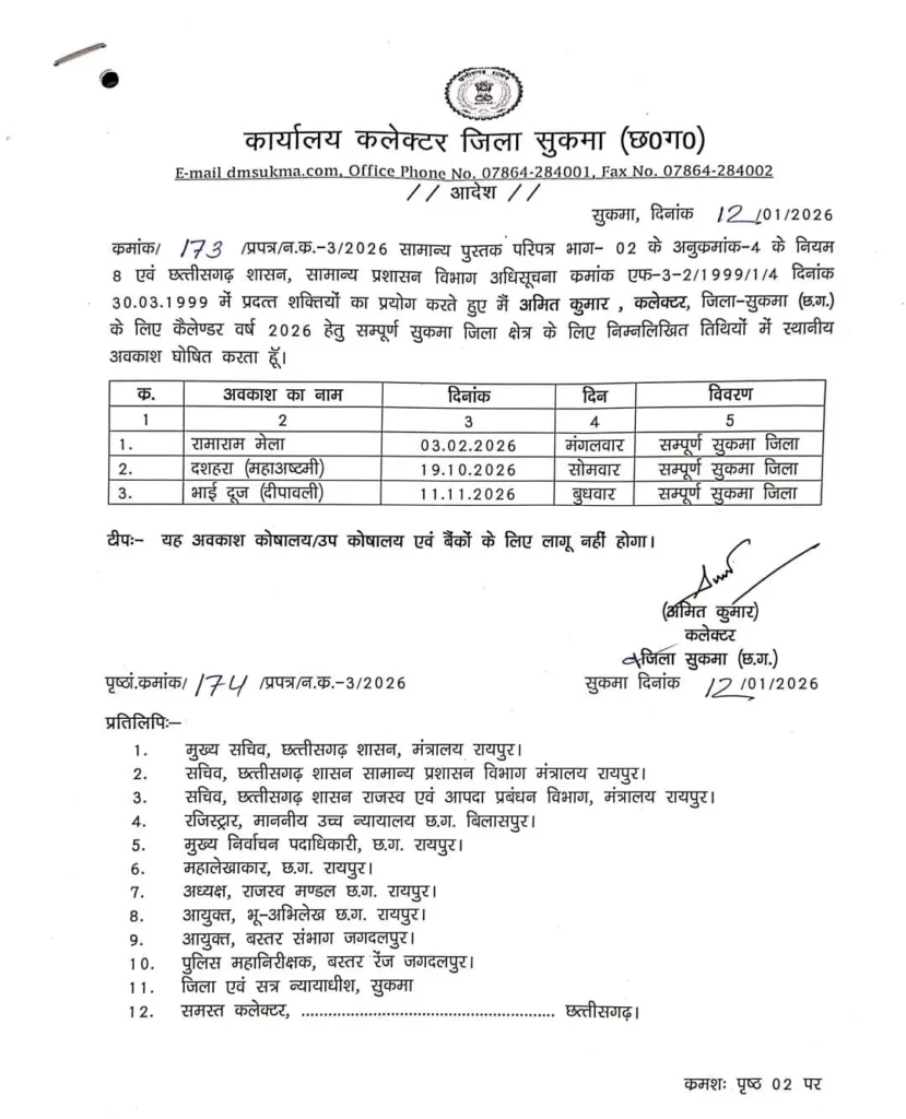 सुकमा : नये साल की शुरुआत हो चुकी है। नये साल में राज्य में होनी वाली छुट्टियों की लिस्ट सामने आ रही है। सार्वजनिक अवकाश के अलावे एच्छिक अवकाश और स्थानीय अवकाश की लिस्ट भी जारी हो रही है। इसी कड़ी में सुकमा जिले से स्थानीय अवकाश की लिस्ट जारी हुई है। कलेक्टर की तरफ से जारी आदेश के मुताबिक 3 फरवरी को रामाराम मेला के मौके पर अवकाश रहेगा. वहीं 19 अक्टूबर को दशहरा महाअष्टमी के दिन छुट्टी होगी, जबकि तीसरी स्थानीय छुट्टी 11 नवंबर को भाई दूज के दिन होगी। हालांकि छुट्टी का ये आदेश ट्रेजरी और बैंक पर लागू नहीं होगा।