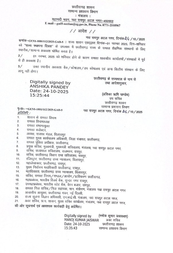रायपुर : छत्तीसगढ़ सरकार ने छुट्टी का ऐलान किया है। 1 नवंबर को राज्य स्थापना दिवस पर प्रदेश में सभी स्कूल कालेजों में स्थानीय व सामान्य अवकाश घोषित किया गया है। 1 नवंबर को शनिवार है,लिहाजा कार्यालयों में पहले से ही अवकाश हैं।