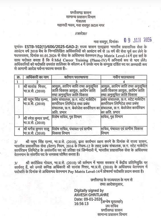 इस संबंध में जारी आदेश में उल्लेख किया गया है कि, “छत्तीसगढ़ राज्य शासन एतद्द्वारा भारतीय प्रशासनिक सेवा के आवंटन वर्ष 2010 बैच के निम्नलिखित अधिकारियों को आवंटन वर्ष से 16 वर्ष की सेवा पूर्ण कर लेने के फलस्वरूप, दिनांक 01.01.2026 से सेवा के अधिसमय वेतनमान Pay Matrix Level-14 में इस शर्त के साथ पदोन्नत करता है कि वे Mid Career Training में अनिवार्य रूप से भाग लेंगे। अधिकारियों को पदोन्नति उपरांत तालिका के कॉलम 4 में उनके नाम के सम्मुख दर्शित पद पर अस्थायी रूप से आगामी आदेश पर्यन्त पदस्थ किया गया है”