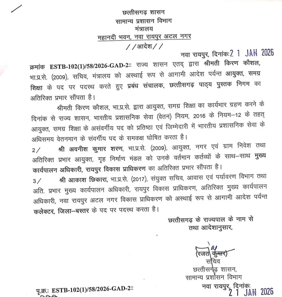 रायपुर : आकाश छिकारा बस्तर के नये कलेक्टर होंगे। राज्य सरकार ने तीन IAS अफसरों की जिम्मेदारी में बदलाव किया है। किरण कौशल को समग्र शिक्षा का कमिश्नर बनाया गया है। वहीं उन्हें पाठ्य पुस्तक निगम के प्रबंध संचालक का एडिश्नल चार्ज भी दिया गया है। आपको बता दें कि समग्र शिक्षा और पाठ्य पुस्तक निगम में पद प्रियंका शुक्ला के केंद्रीय प्रतिनियुक्ति में जाने के बाद से खाली था। अवनीश शरण को नगर व ग्राम निवेश की मौजूदा जिम्मेदारी के साथ-साथ रायपुर विकास प्राधिकरण का भी एडिश्नल चार्ज दिया गया है।