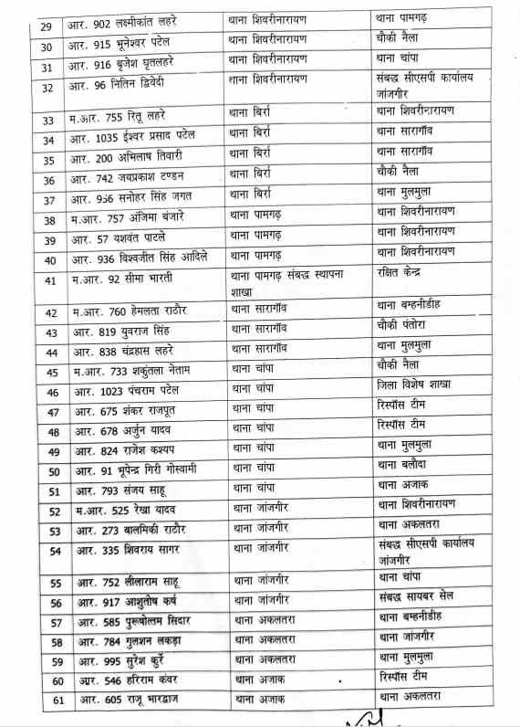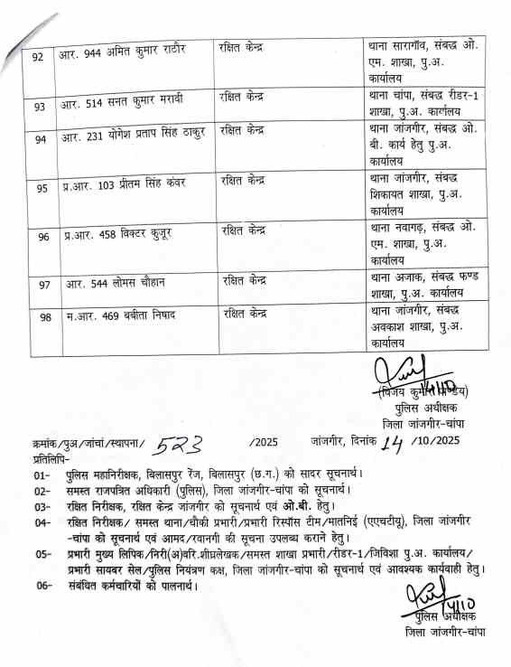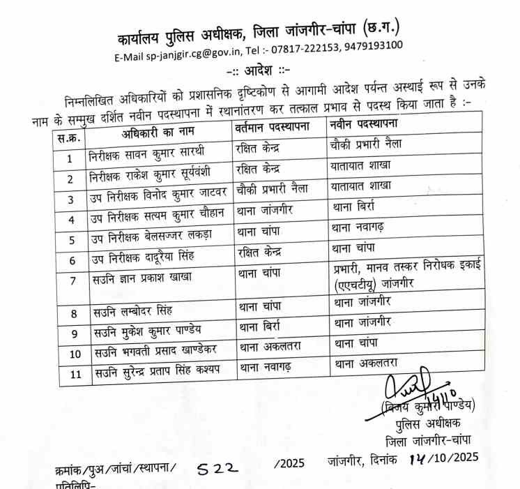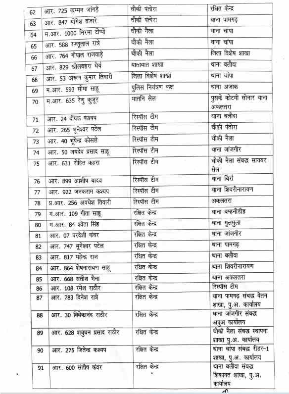 जांजगीर-चांपा : जिले में पुलिस विभाग में बड़े पैमाने पर तबादला किया गया है, एसपी विजय कुमार पाण्डेय ने जिले में 108 पुलिसकर्मियों को इधर से उधर किया है। जारी आदेश में थाना प्रभारी, एसआई, एएसआई, हेड कांस्टेबल, कांस्टेबल शामिल हैं।