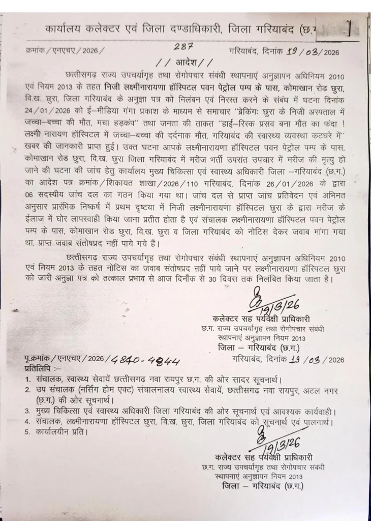 और प्रसूता और नवजात की मौत हो गयी। इस खुलासे के बाद जिला प्रशासन ने अस्पताल प्रबंधन को नोटिस जारी कर जवाब मांगा था। लेकिन संतोषजनक जवाब नहीं मिलने पर गरियाबंद कलेक्टर के निर्देश पर लक्ष्मीनारायणा हॉस्पिटल के विरूद्ध लाइसेंस निलंबन की कार्रवाई की गई। आपको बता दे इससे पहले भी अस्पताल पर गंभीर लापरवाही के आरोप लग चुके हैं और पूर्व में भी एक बार अस्पताल को सील किया जा चुका है। ऐसे में इस कार्रवाई के साथ प्रशासन ने स्पष्ट संदेश दिया है कि स्वास्थ्य सेवाओं में किसी भी प्रकार की लापरवाही बर्दाश्त नहीं की जाएगी।