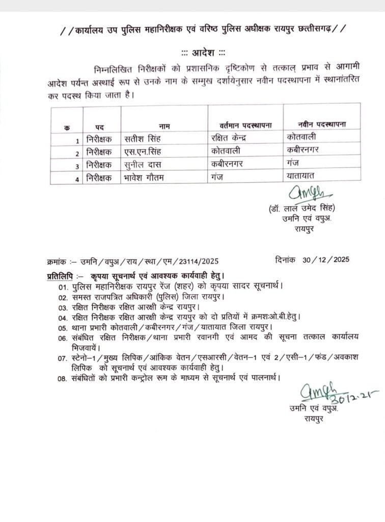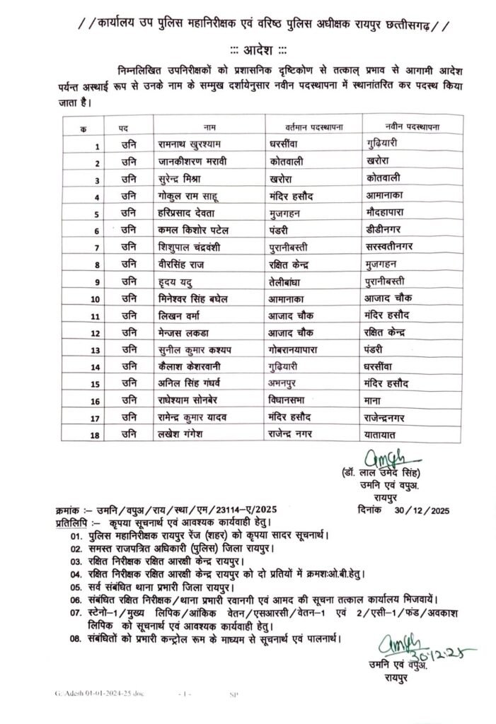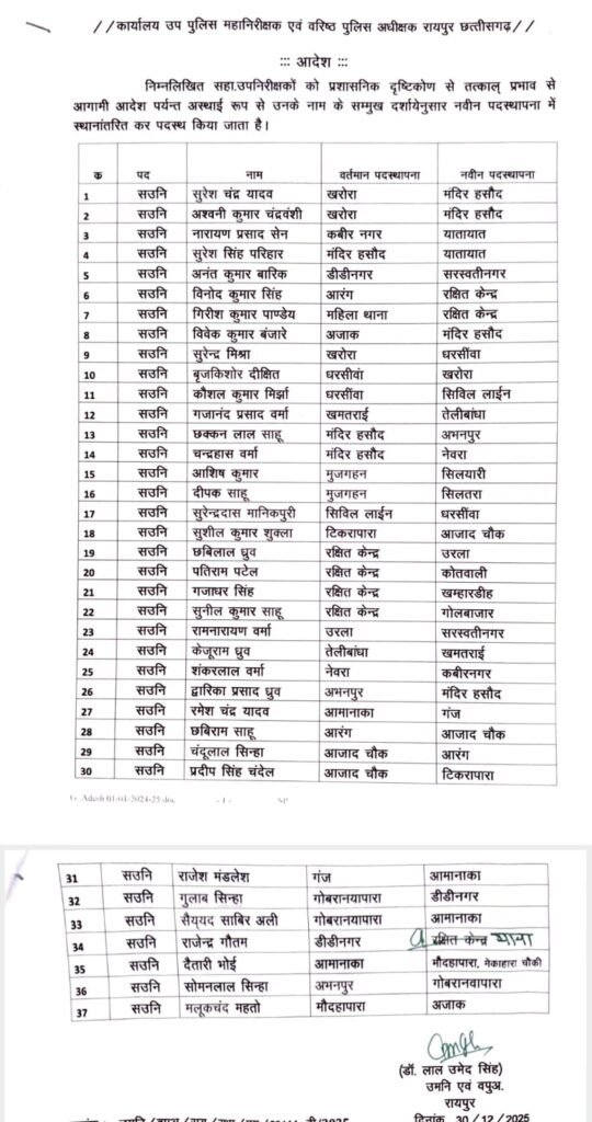 रायपुर : साल के अंतिम दिन जिला पुलिस में बड़ा प्रशासनिक फेरबदल किया गया है। एसएसपी रायपुर ने देर रात तबादलों के आदेश जारी करते हुए मैदानी इलाकों में तैनात 119 पुलिस अधिकारियों का स्थानांतरण किया है।