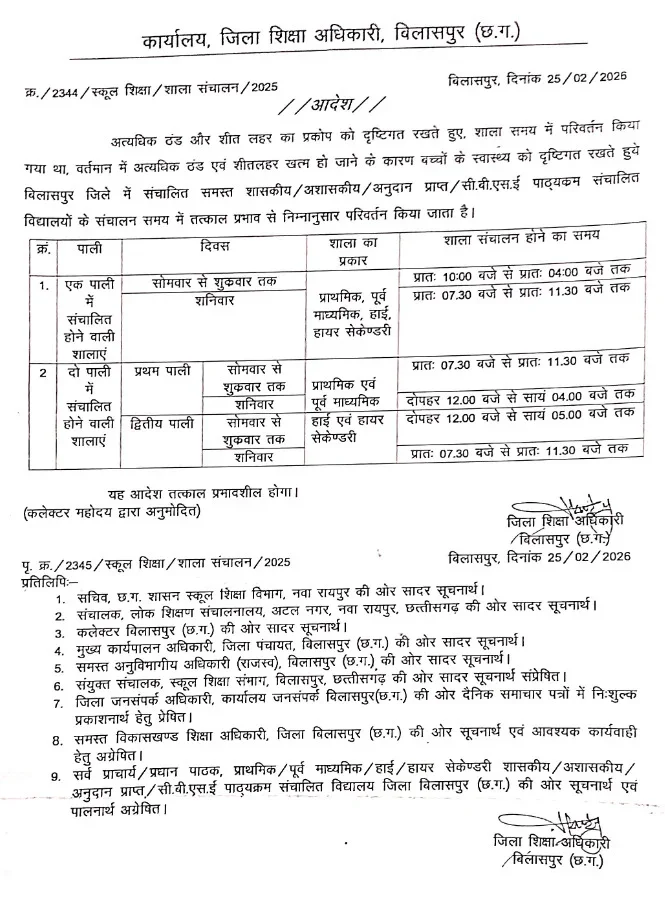 बिलासपुर : स्कूल के समय में बदलाव किया गया है। इस संबंध में आदेश जारी कर दिया गया है। दरअसल ठंड की वजह से स्कूल के समय में बदलाव किया गया था। अब ठंड के खत्म होने के बाद स्कूल के समय को यथावत कर दिया गया है। एक पाली मं संचालित होने वाली शालाएं अब सोमवार से शुक्रवार तक सुबह 10 बजे से शाम चार बजे तक संचालित होगी। जबकि शनिवार को कक्षा सुबह 7.30 बजे से 11.30 बजे तक लगेगी।