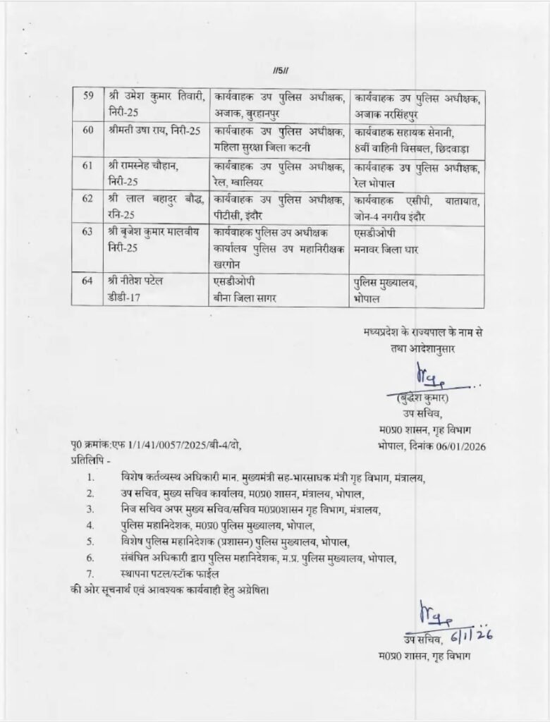 भोपाल : मध्यप्रदेश में राज्य सरकार ने पुलिस महकमे में एक बार फिर बड़ा फेरबदल किया है। प्रदेश में डीएसपी स्तर के कुल 64 अधिकारियों का तबादला किया गया है। जारी आदेश के अनुसार एक दर्जन अधिकारियों को फील्ड पोस्टिंग से हटाकर पुलिस मुख्यालय (पीएचक्यू) और अन्य कार्यालयों में पदस्थ किया गया है। पन्ना जिले के गुन्नौर एसडीओपी मानसिंह टेकाम को पुलिस मुख्यालय भोपाल पदस्थ किया गया है।