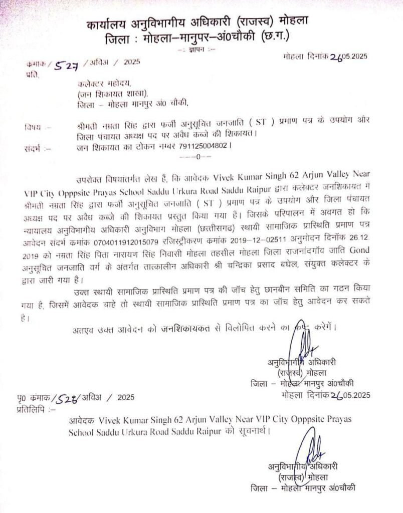 - 1950 से पूर्व छत्तीसगढ़ में नम्रता या उनके परिवार का कोई दस्तावेज, राजस्व रिकॉर्ड या ग्राम सभा प्रस्ताव मौजूद नहीं है, जो ST प्रमाण पत्र के लिए अनिवार्य है।