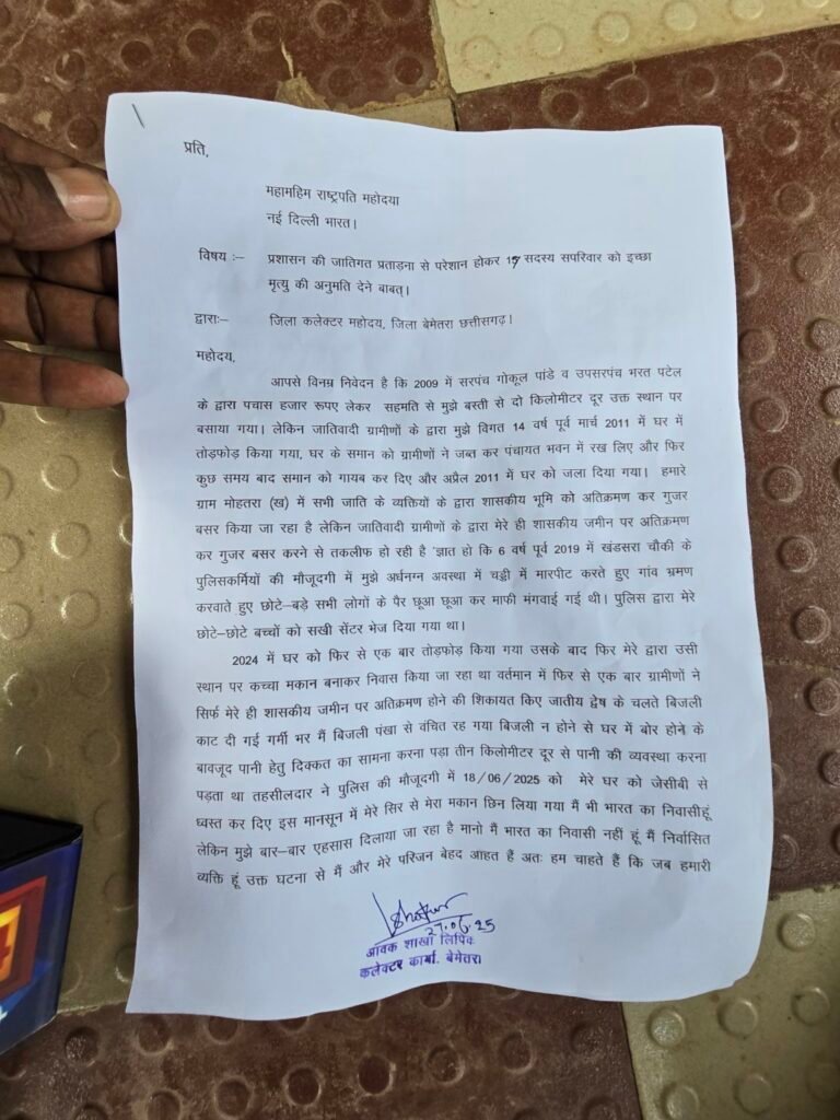 बेमेतरा ज़िले के मोहतरा(ख) गांव से एक बेहद संवेदनशील और मानवता को झकझोर देने वाला मामला सामने आया है। जहां अनुसूचित जाति वर्ग के सतनामी समाज से आने वाले भूमिहीन परिवार ने 14 वर्षों से निरंतर जातीय उत्पीड़न और प्रशासनिक उपेक्षा से तंग आकर परिवार व समाज के लोगों के साथ जिला कार्यालय कलेक्टोरेट पहुंचे। जहां अपर कलेक्टर को राष्ट्रपति के नाम पत्र सौंपा है और सहपरिवार 17 सदस्यों के साथ इच्छा मृत्यु की अनुमति मांगी है।