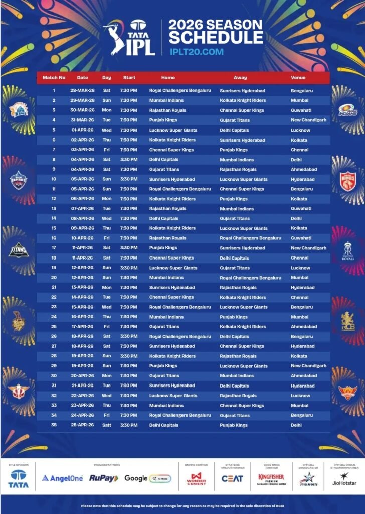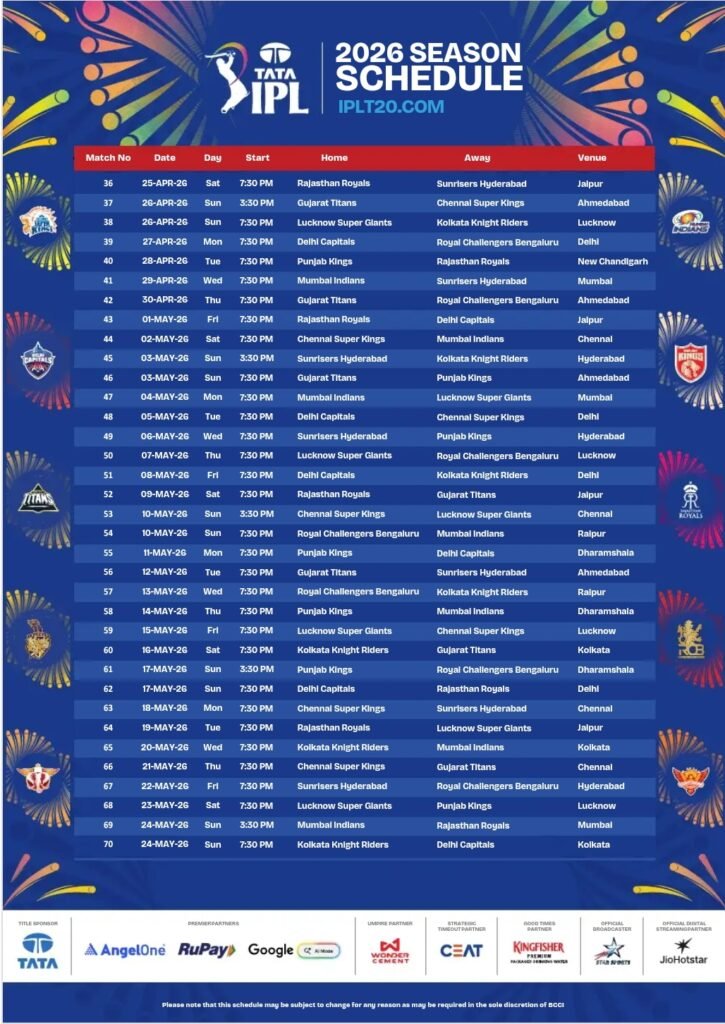 पहला मुकाबला 10 मई को खेला जाएगा, जिसमें रॉयल चैलेंजर्स बेंगलुरु (RCB) का सामना मुंबई इंडियंस (MI) से होगा। दोनों ही टीमें आईपीएल की सबसे लोकप्रिय और मजबूत टीमों में गिनी जाती हैं। स्टार खिलाड़ियों से सजी इन टीमों के बीच मुकाबला रोमांच से भरपूर रहने की उम्मीद है। बल्लेबाजी और गेंदबाजी दोनों ही मोर्चों पर यह मैच दर्शकों के लिए खास होने वाला है।