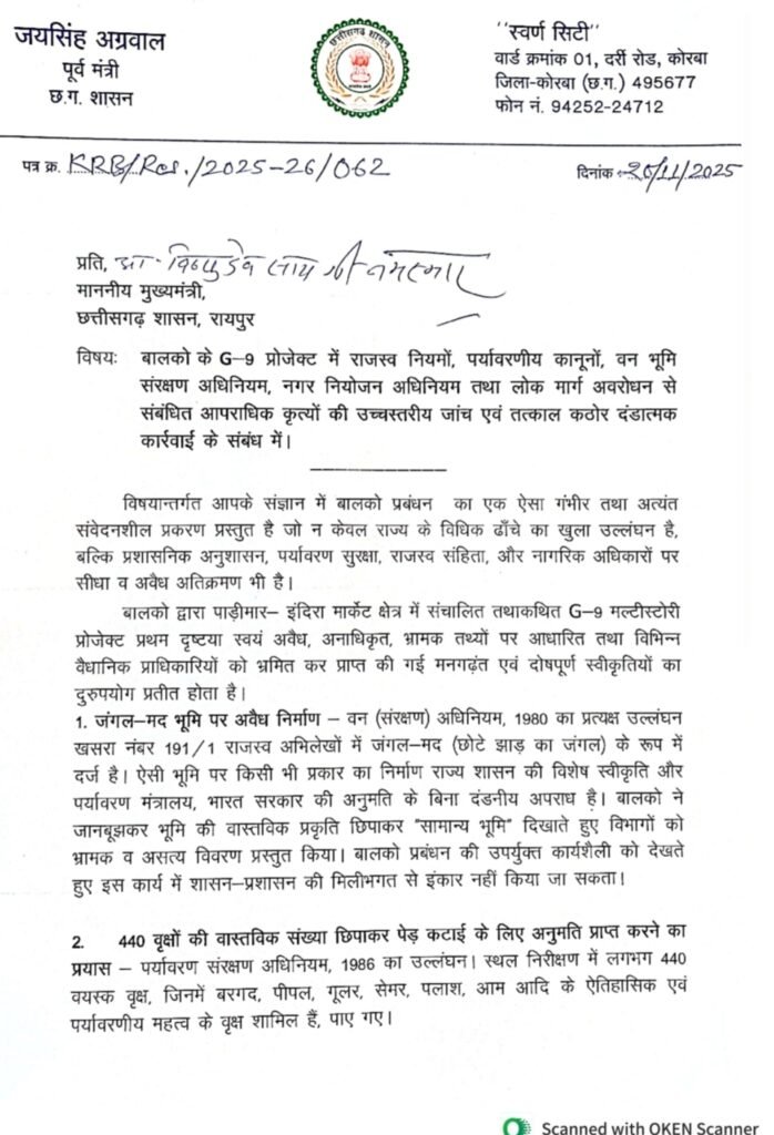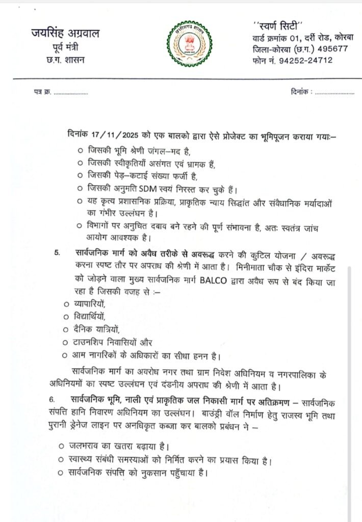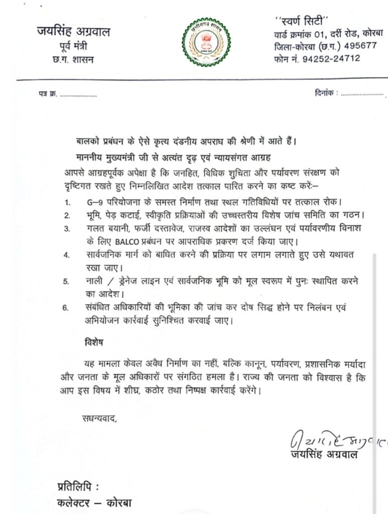 पूर्व मंत्री जयसिंह अग्रवाल ने मुख्यमंत्री से तत्काल G-9 परियोजना के सभी निर्माण कार्यों पर रोक लगाने, भूमि, पर्यावरण व स्वीकृतियों की उच्चस्तरीय विशेष जांच,फर्जी दस्तावेजों व आदेश उल्लंघन पर BALCO प्रबंधन के विरुद्ध आपराधिक प्रकरण दर्ज करने व सार्वजनिक मार्ग को तुरंत खोलने, ड्रेनेज व भूमि को मूल स्थिति में पुनर्स्थापित करने तथा संलिप्त अधिकारियों पर कठोर कार्रवाई जैसे निर्णय लेने की मांग की है। जयसिंह अग्रवाल ने कहा कि….“यह केवल अवैध निर्माण का मामला नहीं, बल्कि कानून, पर्यावरण और नागरिक अधिकारों पर संगठित हमला है।” अग्रवाल ने कहा कि बालको प्रबंधन की इन कार्रवाइयों से यह सिद्ध होता है कि वे स्वयं को कानून से ऊपर मानते हैं।