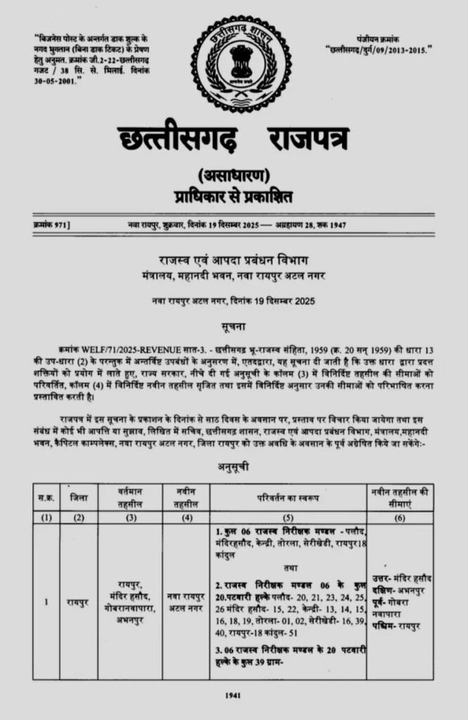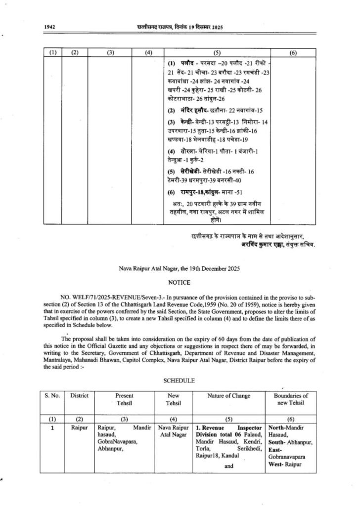 रायपुर : राजधानी क्षेत्र के नवा रायपुर को तहसील का दर्जा देने की तैयारी कर ली गई है। छत्तीसगढ़ राजस्व विभाग ने इसकी अधिसूचना जारी की है। नवा रायपुर तहसील में 6 RI और 20 पटवारी हल्का होगा। वहीं नवा रायपुर तहसील में 39 गांव शामिल किए गए हैं। राजस्व विभाग ने नवा रायपुर तहसील की सीमा परिभाषित कर दी है। जारी अधिसूचना के अनुसार राज्य सरकार ने रायपुर जिले में एक नई तहसील गठित करने और उसकी सीमाएं निर्धारित करने का प्रस्ताव रखा है।