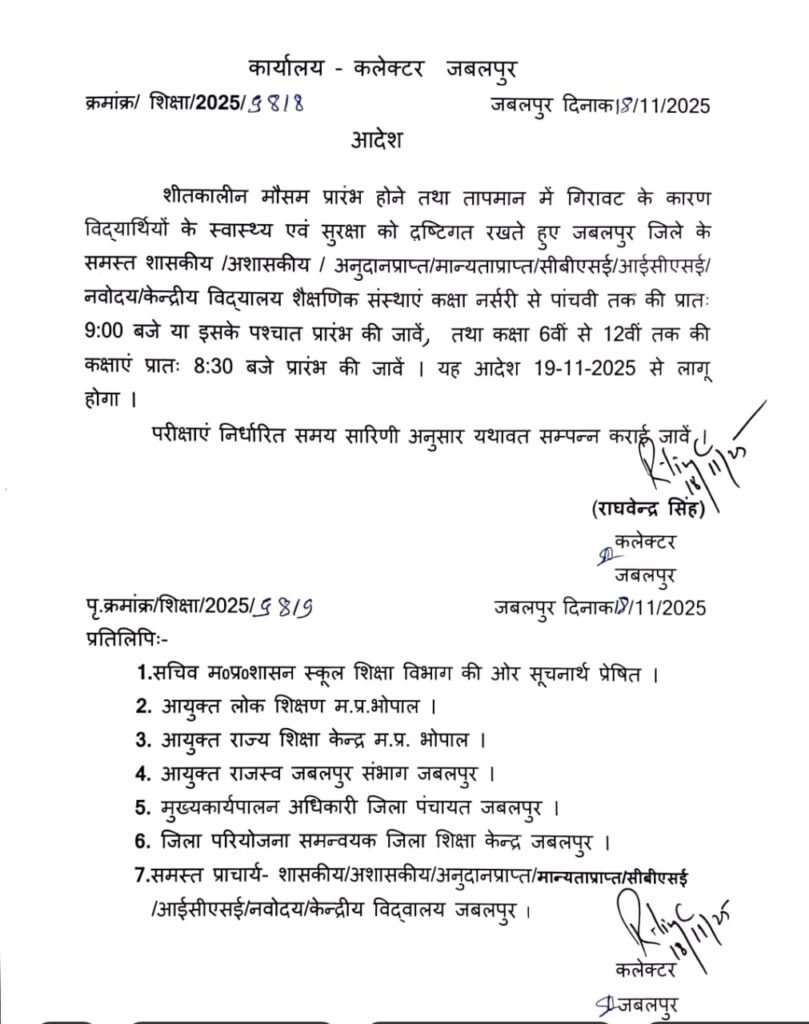 जबलपुर : जबलपुर में तापमान की गिरावट के बाद बढ़ती हुई ठंड के मद्देनजर अब स्कूलों और आंगनबाड़ी के समय में बदलाव किया गया है। जबलपुर कलेक्टर राघवेंद्र सिंह ने सभी स्कूलों के समय में बदलाव किया है जिसमें नर्सरी से पांचवीं तक की कक्षाएं सुबह 9 बजे के बाद लगेंगी। वहीं 6वीं से 12वीं तक की कक्षाएं 8:30 के बाद लगाने का आदेश जारी किया गया है। स्कूलों के साथ ही आंगनबाड़ी के समय में भी बदलाव किया गया है। जहां अब आंगनबाड़ी सुबह 10 बजे से 5 बजे तक खुलेगी लेकिन आंगनबाड़ी में बच्चों की उपस्थिति सुबह 10 बजे से दोपहर 2 बजे तक रहेगी।