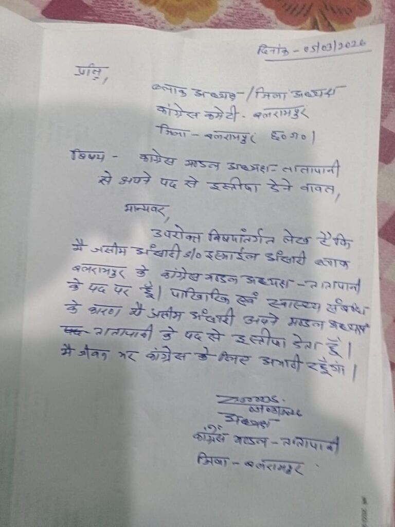 बलरामपुर : छत्तीसगढ़ कांग्रेस में पिछले कुछ समय से लगातार अंतर्कलह जारी है। कांग्रेस संगठन के कई पदाधिकारी लगातार इस्तीफा देकर पार्टी से अलग हो रहे हैं। इसी कड़ी में छत्तीसगढ़ के बलरामपुर जिले से एक बड़ी खबर निकलकर सामने आई है। बलरामपुर जिले के कांग्रेस जिला महामंत्री संजीव गुप्ता ने अपने पद से इस्तीफा दे दिया है। इतना ही नहीं ब्लॉक अध्यक्ष जसिम अंसारी ने भी अपने पद से इस्तीफा दे दिया है।
