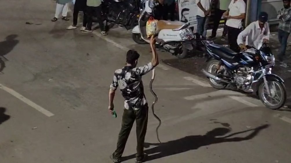 सागर : सागर के झूला वाले फर्श पर स्थित चौराहे से एक शराबी और सांप का एक वीडियो कल शाम से सोशल मीडिया पर तेजी से वायरल हो रहा है। वीडियो में एक शराबी युवक एक सांप को पकड़कर खेलता दिखाई दे रहा है। बीच सड़क शराबी कभी सांप को अपने गले में डालता तो कभी लोगों को डराता। हालांकि वीडियो मेडिक रहे युवक की पहचान अब तक नहीं हो पाई है, लेकिन ये वीडियो शहर में चर्चा का विषय बना हुआ है।