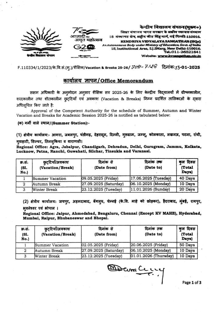 मिली जानकारी के अनुसार केंद्रीय विद्यालय समिति ने सभी स्कूलों में शीतकालीन अवकाश की छुट्टी के लिए नोटिफिकेशन जारी कर दिया है। जारी निर्देश के अनुसार अत्यधिक गर्मी वाले स्थान आगरा, जबलपुर, चंडीगढ़, देहरादून, दिल्ली, गुरुग्राम, जम्मू, कोलकाता, लखनऊ, पटना, रांची, गुवाहाटी, सिल्चर, तिनसुकिया व वाराणसी में 20 दिनों तक शीतकालीन अवकाश रहेगी। जबकि जयपुर, अहमदाबाद, बेंगलुरु, चेन्नई (के.वि. माहे को छोड़कर), हैदराबाद, मुंबई, रायपुर, भुवनेश्वर एवं भोपाल में बच्चों को 10 दिन का शीतकालीन अवकाश दिया जाएगा।