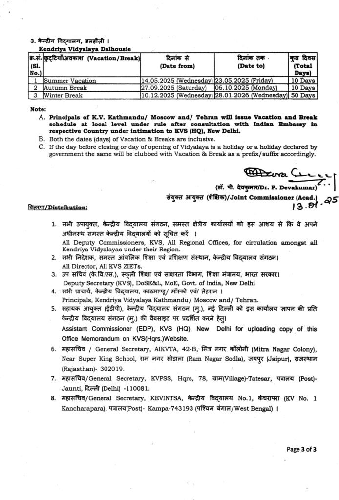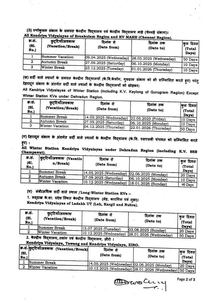 वहीं, इस दिशा निर्देश में अत्यधिक ठंडी वाले स्थान जैसे लद्दाख, देहरादून के स्कूलों के लिए 40 से 50 दिन का शीतकालीन अवकाश तय किया गया है। यहां शीतकालीन अवकाश 4 दिसंबर से शुरू होंगे और 22 दिसंबर तक स्कूल बंद रहेंगे। इस संबंध में केंद्रीय विद्यालय प्रबंधन की ओर से नोटिफिकेशन जारी कर दिया गया है।